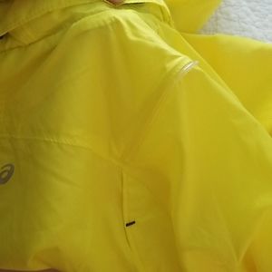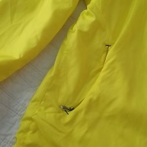 The ultimate running jacket! Bright color, reflective strips, 1 battery powered light up strip on right shoulder. Concealed hood, zipper pockets. Mesh lining. Waterproof. You'll be superxsafe and prepared running in this!
