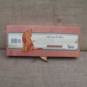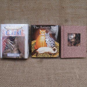 Running Press Cats Soapbox Editions gift set. Pull on ribbon to open it like a drawer. Gift set includes 3 mini size items: mini book, mini journal/blank book, mini tote with notecards. Mini book is called "The Artistic Cat", with praise, poems, and paintings. Mini journal has blank pages and a mini pen. Cat photo in window can be removed and replaced with one of your own. Tote has 6 mini notecards with envelopes, mini pen, mini double photo frame. Mini tote with contents is sealed in original plastic. The 3 items are approximately 3 1/4 inches by 2 3/4 inches. Outer box is 9 inches by 3 3/4 inches, 1 1/2 inches thick. Good condition. Box is good, Books are good. Tote is still in wrap, unused. Great for any cat lover! tags: cat, kitty, kitten, animal, miniature, mini, gift set, box set, book, notes, journal, collectible, art, running press