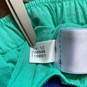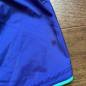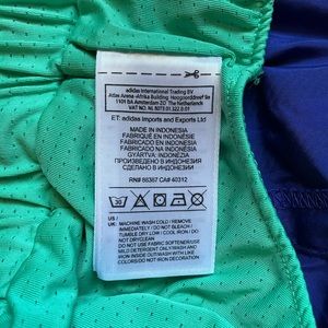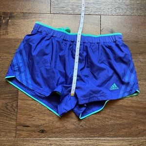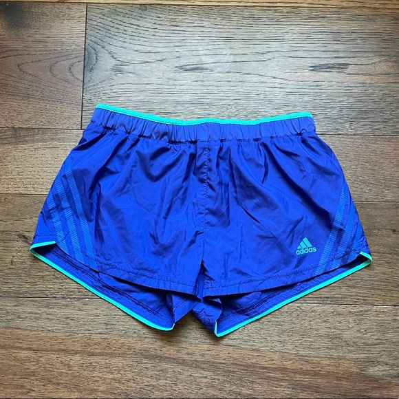 Adidas running shorts. Blue with turquoise trim. Small pocket inside. Small stain.