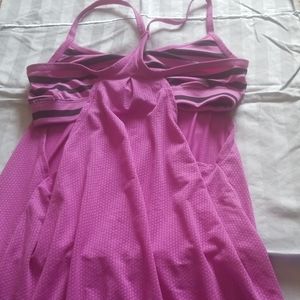 Purple and black mesh with racer back and fitted bottom with interior bra.