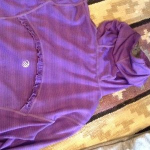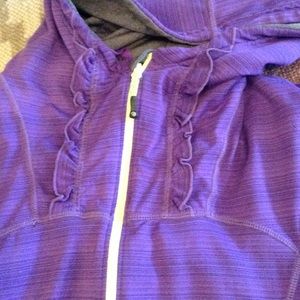 Deep purple. Ruffle details front & back. Hood has a string for adjustments. In very good condition.