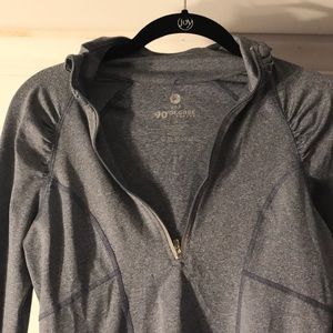 Silver, gray running jacket. Stretchy material. Ruffled at the wrists with a thumb hole. Zipper with reflectors at the neck. Great condition.