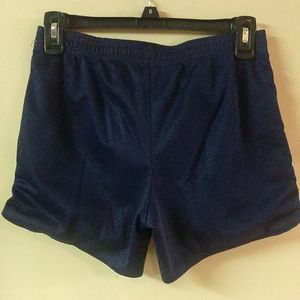 Dark blue running shorts with green and white stripes, definitely shows signs of wear (the white is rather gray-- see photo) but the shorts are still in good condition for running.