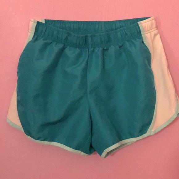 Teal running shorts, fits sizes 8-10, puffy and only worn once, great condition!! Also they absorb sweat amazingly well :)