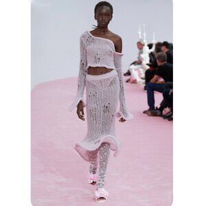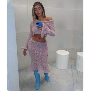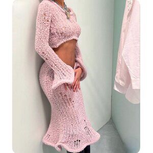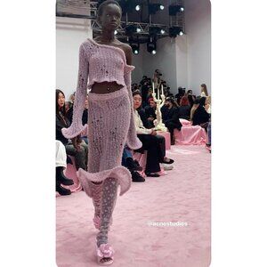 Runway Acne Studios dusty pink skirt and top is crafted from a soft lightweight wool blend with a hairy finish and semi-sheer appearance. Adorned with a wavy malleable wired hem. Cut to a fitted silhouette with a flared hem and mid length.