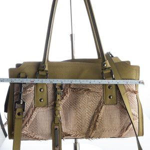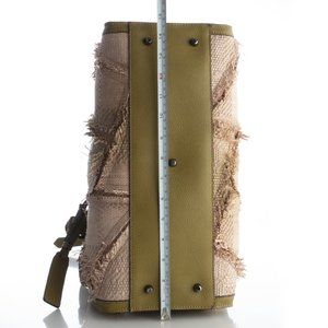 Earthly color palette features - plain textured leather and patchwork raffia.