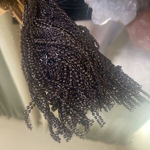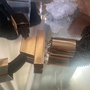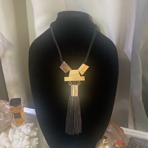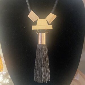 Description: runway high end bib necklace. Gold tone heardware. Black chain fringe and black rope. 16 inches long with 3 inch extender and lobster closure. Beautiful piece.