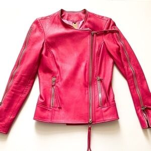 Magazine & Runway Featured Pink Zipper Leather Runway Jacket by Thomas Wylde. Amazing piece. Stand out from the crowd, in this amazing runway piece, beautifully crafted, unique design, immaculate workmanship.. perfection. Please note there are a few minor flaws, as highlighted, none of them are noticeable and this jacked has only been worn for the photo shoot. Small mark on elbow, collar, small mark on lining. Please see measurements to ensure proper fit.