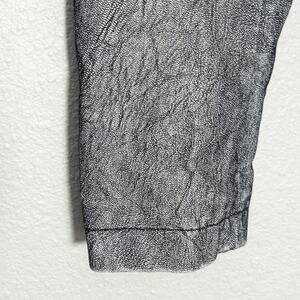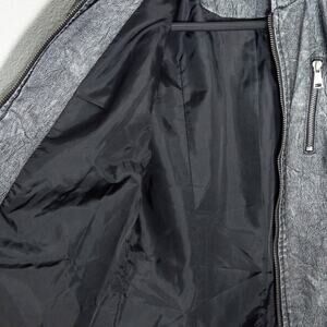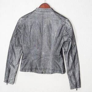 Runway New York women’s moto jacket in metallic grey with a cracked-concrete print and futuristic sheen. Women’s size small. This is a structured, cropped moto style with heavy industrial influences: zip-front closure, dual vertical chest zippers, and functional zipped pockets at the hips. Lightweight satin lining inside. The sleeves and shoulders feature stitched panels that channel biker-armor energy without adding bulk.
