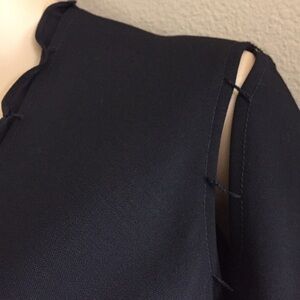 Stunning condition. 1 button loop closure. Sleeves offer a glimpse of skin, at shoulder. Very sleek. Lightly ruffle hemmed front panel, allows this be worn as a tuxedo jacket or evening jacket. Yves Saint Laurent. Fully lined in silk. 100% wool. Shoulder to shoulder 15" Waist 26" Sleeves 24" Underarm to Underarm 17".