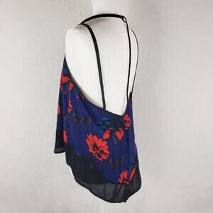 Runway Story Cami Low Back Top Women S Flowy Thin Straps Blue Red Black Floral High Low hem and Sheer panel on Bottom.