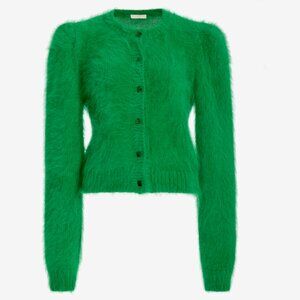 As seen on the FW '24 Runway, The Aisha Cardigan is a cozy beauty made from our plush, Italian-spun angora-blend. This long-sleeve style is a vibrant emerald green hue, has a close fit, and is finished with ribbed trims for sumptuous contrast.