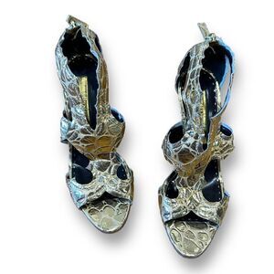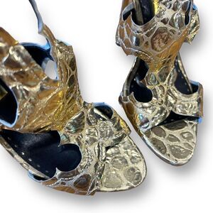 Rupert Sanderson Gold Gladiator Croc Reptile Leaf Print open Toe Heel Sandals