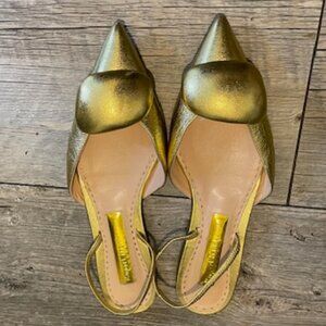 Take any outfit to the next level, with these gold-tone metallic leather Rupert Sanderson pointed-toe flats with tonal stitching and stacked heels. Includes box and dust bag.