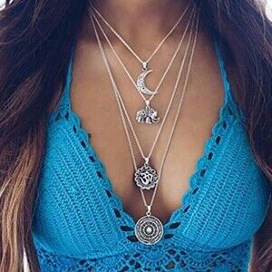 Rurah Ancient Silver Multi - layer Moon Elephant 3D Pendant Long Necklace Fashion Jewelry