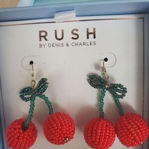 Vibrant red cherry earrings with green beaded leaves. Handmade by artisans.