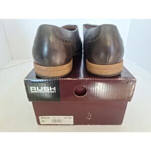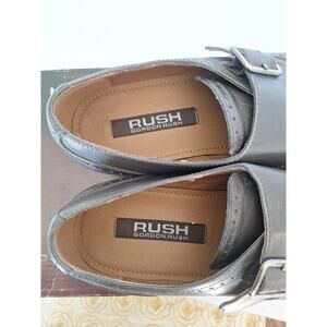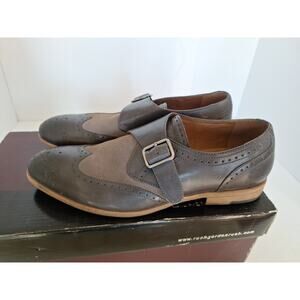 Stylish Rush by Gordon Rush Grovelea single monk strap dress shoes in grey leather with suede accents and brogue detailing. Genuine leather upper, man-made balance, model 101248 (size 9M). Sleek almond toe, low stacked heel, and classic buckle closure. Includes original box (shows light edge wear).