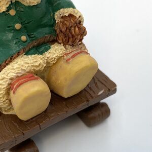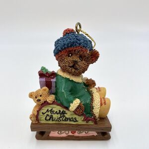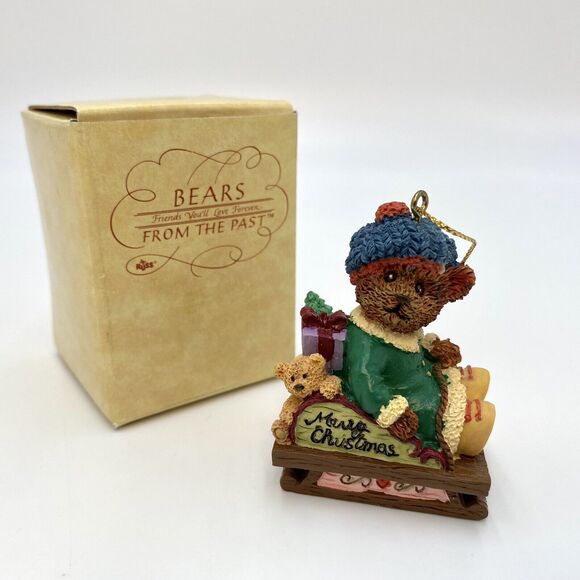 Ornament and box are in great condition with minimal signs of wear. Box is not original to this ornament; however, it is from the same series. Ornament has a small unpainted spot on the sled, as pictured above. This hand-painted resin ornament measuring 2 1/2 inches tall, depicts a teddy bear on top of a sled full of presents.