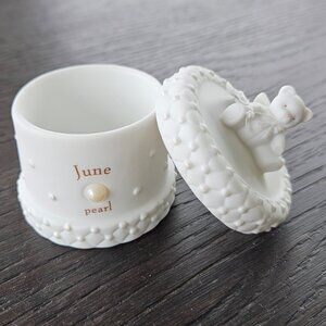 This is an adorable ceramic trinket box with a bear angel lid and June pearl on the front. A wonderful gift for any June Baby or girl. Great for Toothfairy and as they get older trinkets...Brand new with original packaging and tags in original box. From the 1990's or early 2000's