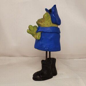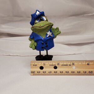 This whimsical handcrafted figurine showcases a frog dressed as a police officer, complete with a blue uniform, black boots, and a star detail. Artist-signed.