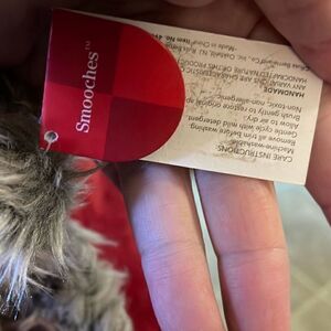 Shaggy gray and white Russ berrie bear Smooches NWT Tag has some marks on it.