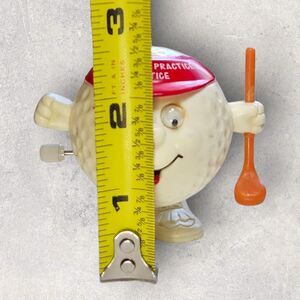 Looking for the perfect holiday gift for the golfer in your life? This vintage Russ Berrie wind-up hopper toy is a rare find: a smiling golf ball character wearing a red visor that reads Practice, Practice, Practice, complete with googly eyes and a bright orange club. Wind him up and he hops across the table (sometimes backwards, its part of his charm!).
