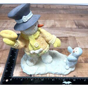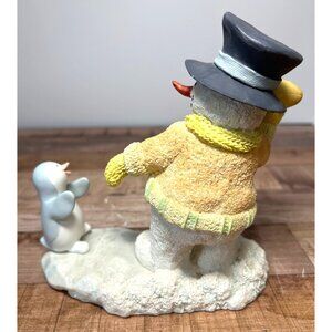 A delightful winter-themed ceramic figurine featuring a charming snowman in a yellow knitted sweater and hat, playfully interacting with a small blue bird on a textured snow base.