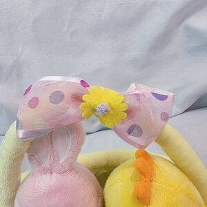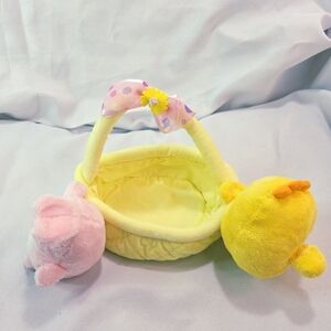 Adorable yellow plush Easter basket "filled" with with 4 Inch pink plush bunny rabbit and 4 Inch yellow chick.