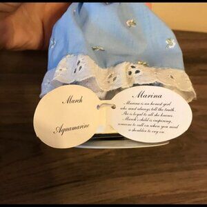 Adorable doll to celebrate March birthdays! Marina is her name and while she doesn’t come with original packaging, she has her original tag still attached. She has a cute Aquamarine style necklace. Has been displayed on a shelf at a smoke and pet free home. Her hair is a little frizzed but otherwise no signs of wear.
