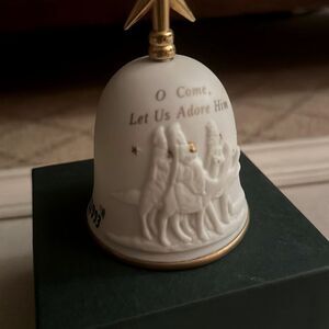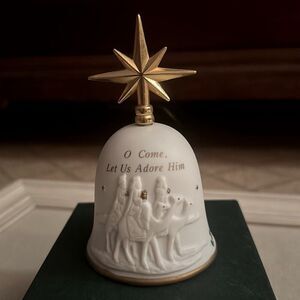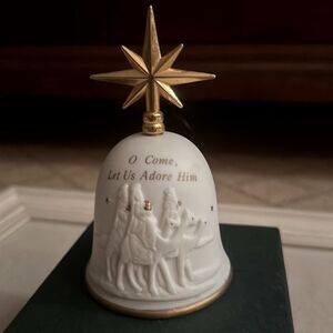 Russ Collectible holiday The First Noel Porcelain Bell Item #15453 Wise Men “O come let us adore him” 3 wisemen Ceramic bell christmas holiday Bisque white with Star on top. Gold rim around bottom of bell. Excellent vintage condition with no chips cracks or scratches. Dated with 1993 on side.