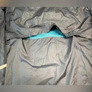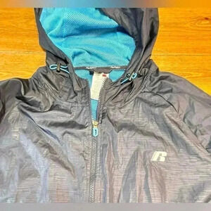 Russel running full zip jacket in navy nylon with light blue mesh accents, features zippered pockets, reflective panels on sleeves, back venting, adjustable hood. Perfect packable weight when needed. Men’s 3X