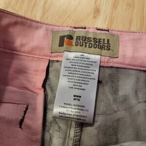 The Russel Outdoors M 8/10 Camouflage Straight Leg Cargo Pants feature a stylish pink lining and a convenient zip snap closure. Made by Russell Athletic, these pants are perfect for casual occasions and are machine washable for easy care. The straight leg design and cargo style make them both comfortable and practical, while the pockets add functionality. With a size M waist and 31-inch inseam, these pants are designed for women who appreciate both fashion and functionality in their wardrobe.