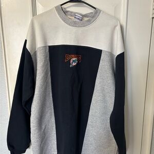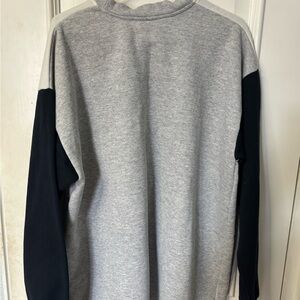 Stylish Russell Athletic sweatshirt. Features black and gray color blocks. Comfortable and casual design.