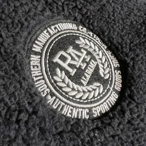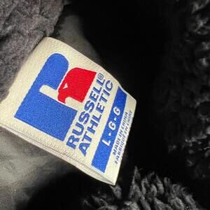 Men’s Russell Athletic black sherpa fleece pullover, size Large. Features soft, warm sherpa upper with quilted lower panel and sleeves, 1/4 zip front, snap-button kangaroo pocket, chest pocket, and embroidered RA crest logo patch. Ribbed hem and cuffs for a comfortable fit. Made in China. Pre-owned, in good condition — see photos for details. Ideal for casual wear, outdoor activities, and staying warm in cool weather.
