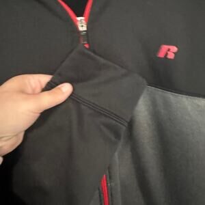 Russell Athletics Full Zip Jacket w/ Hood / Hoodie in Men's Size Large / 42 - 44. 100% polyester, heather gray, black, with red, hooded. Jacket is in very good used condition with no flaws or stains other than some minor wash wear. Full zipper, athletic wear, athleisure, mediumweight jacket. Please see close-up pictures for condition details.