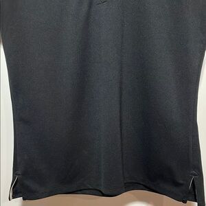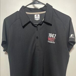 Classic black polo shirt by Russell. Features embroidered logos on chest and sleeve.