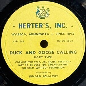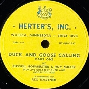 This beautifully crafted 78 RPM piece features "Duck and Goose Calling Part One" by Russell Hofmeister and Roy Miller, alongside Rex Kastner's narration, and "Part Two" recorded by Ewald Schacht. A historical gem, it embodies Herter's mastery in outdoor culture, born in Waseca, Minnesota, since 1893