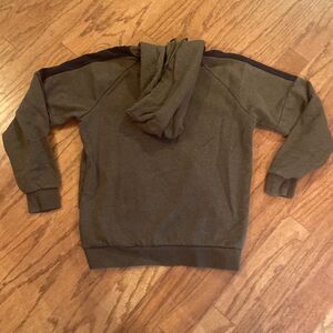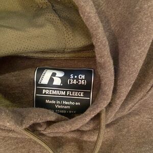 Excellent condition Russell size, small, premium fleece sweatshirt, with pockets in the front, brown with a black stripe across shoulder on top, hooded, (971)