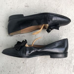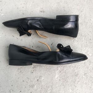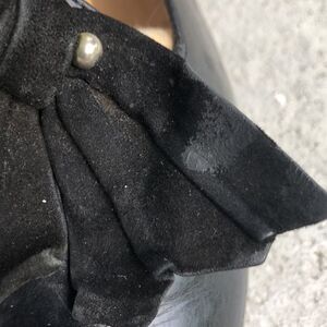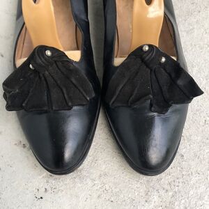 Vintage black leather with suede swirl. Please look at the pictures, the shoes are not new but if you put nonskid soles on the bottom, they would have lots of life.