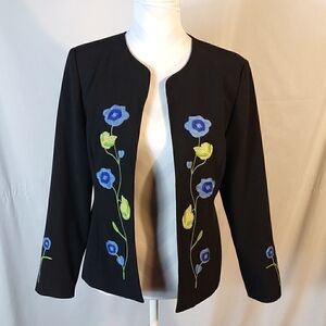 This black with blue and yellow embroidered florals Russell Kemp open front jacket is a size 6. Fully lined. Shell: 63% polyester 32% rayon 5% spandex and machine washable. Pre-owned and in excellent condition. All offers welcome.