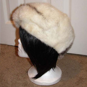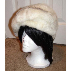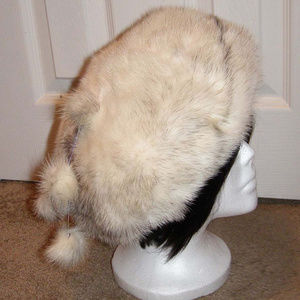 Like new hat, worn a couple times only. Worn sort of slouchy to the side, like a beret, with 3 fur pom poms.