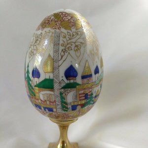 Russian Imperial Lomonosov 'Old Russian Architecture' Hand Painted Egg. Stamped and signed, beautiful egg measuring approximately 3 3/4" x 2 1/2" features a beautiful cityscape of old Russian architecture. The egg does not come with a stand.
