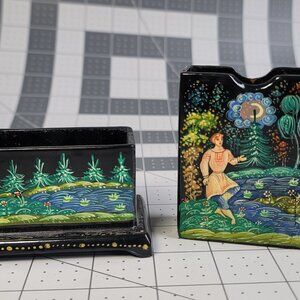 Russian Lacquer Playing Card or Cigarette Box & Stand Artist Signed Vintage