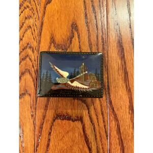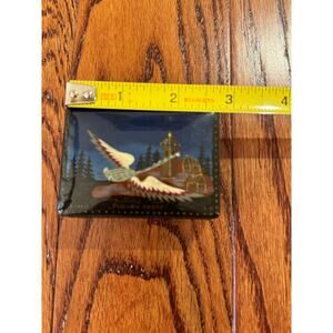 Russian Lacquered Black Trinket Box Artist Signed Crane Loon Bird Flying Forest