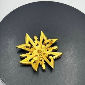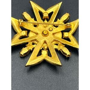 This is a classic Maltese Cross pendant/pin with a twist. It is heavily jeweled and features at its center the classic Russian two headed eagle coat of arms from the era of Faberge. It is a large 2 inch square design and is very substantial in its construction. It is studded with clear and ruby colored rhinestones of various dimensions and the gold eagle rests on a surface of black lacquer.