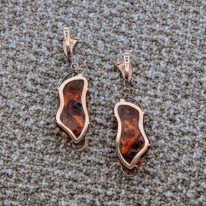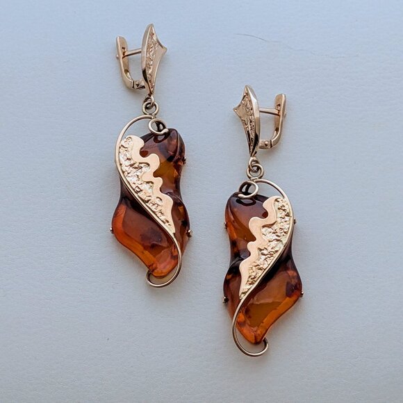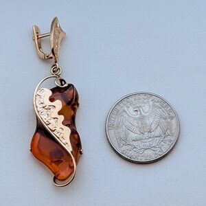 Russian Russia 14K 585 Rose Pink Gold Baltic Honey Amber Dangle Drop Earrings