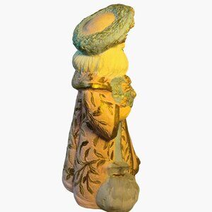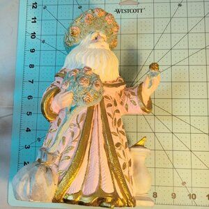 Charming hand-painted Santa Claus figurine adorned with intricate gold color accents and floral details. Ideal for holiday decor or as a collectible.