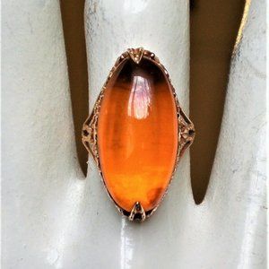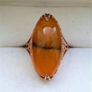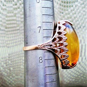 Gorgeous Vintage Russian Russia Soviet USSR solid 14K 583 Rose Pink Gold Russian Baltic Honey Amber Filigree Cocktail Dinner Ring about size 7.5-7.75 (marked "583 with star, hammer and sickle" and acid tested). Top of the ring is about 26mm by 13.5mm. This unique Ring weighs about 5.3 grams and is in great vintage pre-owned condition