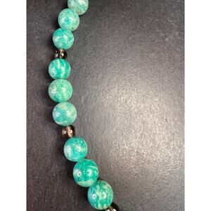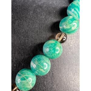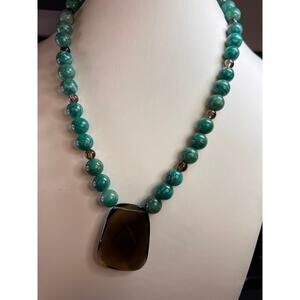 Genuine Russian amazonite 10 mm beads stationed with 6 mm smoky quartz beads. Measures 18 inches in length with a 925 sterling silver clasp. Strung on sturdy jewelers wire. Sadly the big brown clear stone in the center is not smoky quartz like the smaller beads. It tests as some kind of synthetic / glass.