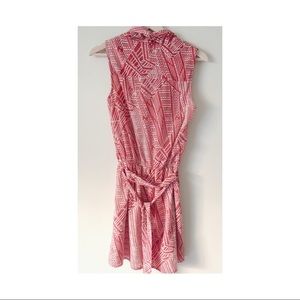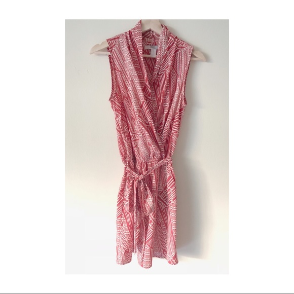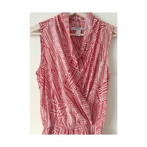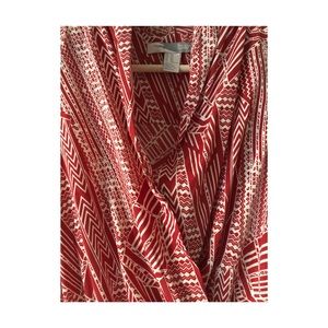 Rust color abstract print dress with a wrap-style top portion. Seriously loved this dress but it doesn’t fit me anymore. Great for work or even an evening out. Neckline has snap to keep the top loses and it draped really nicely. This the forever 21 contemporary brand so closer to normal sizes compared to regular f21 with everything tiny. NO TRADES